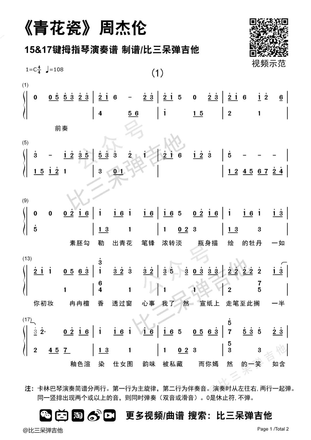 青花瓷 拇指琴演奏 简谱 比三呆弹吉他 微信公众号文章阅读 Wemp